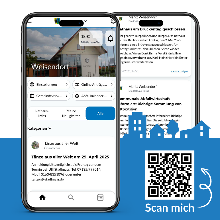 Weisendorf immer in Ihrer Hosentasche: In unserer Heimat-Info App erhalten Sie als Bürger sämtliche Informationen, wie News oder Veranstaltungen per Push-Nachricht direkt aufs Smartphone oder Tablet. Jetzt kostenlos herunterladen und immer auf dem neuesten Stand bleiben!